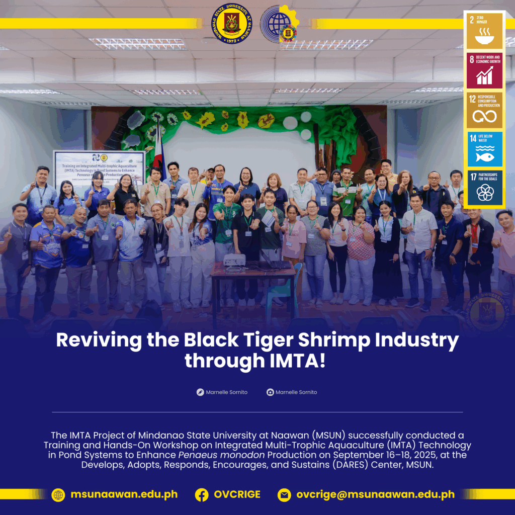 The IMTA Project of Mindanao State University at Naawan (MSUN) successfully conducted a Training and Hands-On Workshop on Integrated Multi-Trophic Aquaculture (IMTA) Technology in Pond Systems to Enhance Penaeus monodon Production on September 16–18, 2025, at the Develops, Adopts, Responds, Encourages, and Sustains (DARES) Center, MSUN. A total of 34 participants eagerly joined the three-day training, representing the LGUs of Bislig, Surigao del Sur, and Lala, Lanao del Norte, along with fish farmers, pond operators, and private pond owners from Iligan City, Lanao del Norte, and Digos, Davao del Sur. Adding diversity to the group were enthusiastic undergraduate, master’s, and doctoral students in Aquaculture and Marine Biology, who were eager to learn and contribute to the future of sustainable aquaculture. The opening program featured inspiring messages from Dr. Elnor C. Roa, Chancellor of MSUN, and Dr. Adelaida T. Calpe, Director of the DOST-PCAARRD Inland Aquatic Resources Research Division (IARRD). Dr. Aida D. Perpetua, Director of the DARES Center and project member, then introduced the participants, outlined house rules, and set expectations for the training. This training marked a timely and vital step toward reviving the Penaeus monodon (black tiger shrimp) industry. This once-thriving, high-value aquaculture commodity has declined in recent years due to environmental degradation. By showcasing IMTA as an innovative and sustainable technology, the workshop highlighted its potential to restore shrimp productivity, enhance ecological balance, and create long-term livelihood opportunities for fish farmers. Rooted in the principle of biomimicry, IMTA replicates the natural interactions of aquatic species, where the waste of one organism becomes a resource for another, resulting in a balanced and efficient pond ecosystem. The sessions offered a rich combination of lectures, workshops, and field demonstrations. Expert discussions by Dr. Elgen M. Arriesgado (Project Leader), Dr. Dan M. Arriesgado, and Assoc. Prof. Victor R. Navarro explored the historical evolution of the shrimp industry, principles of IMTA, and advanced aquaculture management practices. Hands-on activities equipped participants with practical aquaculture skills, including pond preparation, water quality monitoring, seaweed planting, installation of pond system components and confinement, and stocking of various organisms. They also learned to evaluate healthy seed stocks, check P. monodon post-larvae, create feeding trays, and determine the optimal species combinations for an effective IMTA system. A field visit to Lala, Lanao del Norte, further demonstrated the application of tea seed and lime for pond preparation—bridging theory with actual practice. This successful event was made possible through the unwavering support of DOST-PCAARRD IARRD, represented by Dr. Adelaida T. Calpe, together with Ms. Geraldine Mae Olaer, Ms. Kristine Joy Tandang, and Ms. Rizza Ramoran. The program concluded with closing remarks from Dr. Melvin B. Carlos, Deputy Executive Director for ARMSS, DOST-PCAARRD, delivered on his behalf by Dr. Calpe. Together, we remain committed to advancing sustainable aquaculture innovations and leading the way toward a resilient, revitalized, and future-ready Penaeus monodon industry.