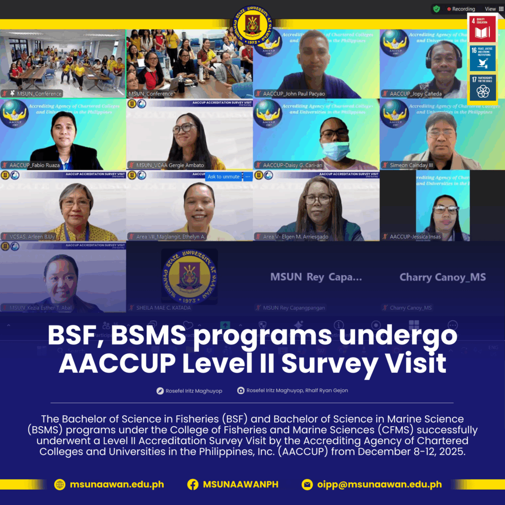 The Bachelor of Science in Fisheries (BSF) and Bachelor of Science in Marine Science (BSMS) programs under the College of Fisheries and Marine Sciences (CFMS) successfully underwent a Level II Accreditation Survey Visit by the Accrediting Agency of Chartered Colleges and Universities in the Philippines, Inc. (AACCUP) from December 8-12, 2025.