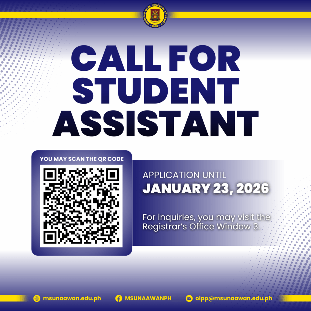 Mindanao State University at Naawan is now accepting applications for Student Assistants for the 2nd Semester of SY 2025–2026. This opportunity is open to qualified and deserving students who are willing to render assistance to various university offices while gaining valuable experience, developing professional skills, and contributing to the effective delivery of campus services.