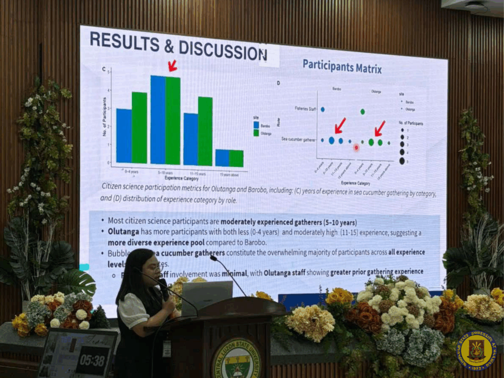 Ms. Sornito presented her research on empowering sea cucumber gatherers through a citizen-science approach in assessing sea cucumber stocks across Mindanao. Meanwhile, Mr. Emmanuel Delloro shared his study online titled “Assessment of Artisanal Fisheries in Selected Municipalities of Northern Mindanao Through a Participatory Approach.”